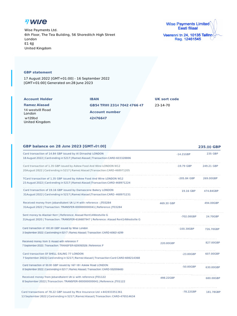 23 August 2022 | Card ending in 5217 | Ramez Alasad |Transaction:CARD-468971224