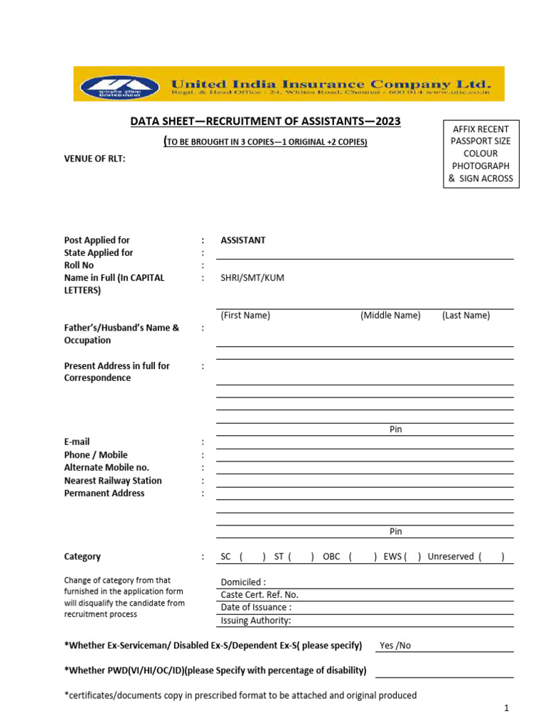 Note: *The data sheet should be signed in front of the Company Officials at the Regional Language Test Venue