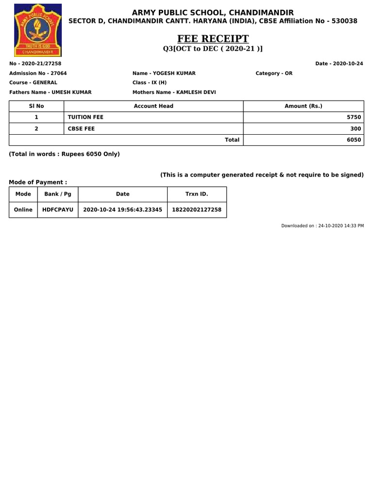 Fathers Name - UMESH KUMAR Mothers Name - KAMLESH DEVI