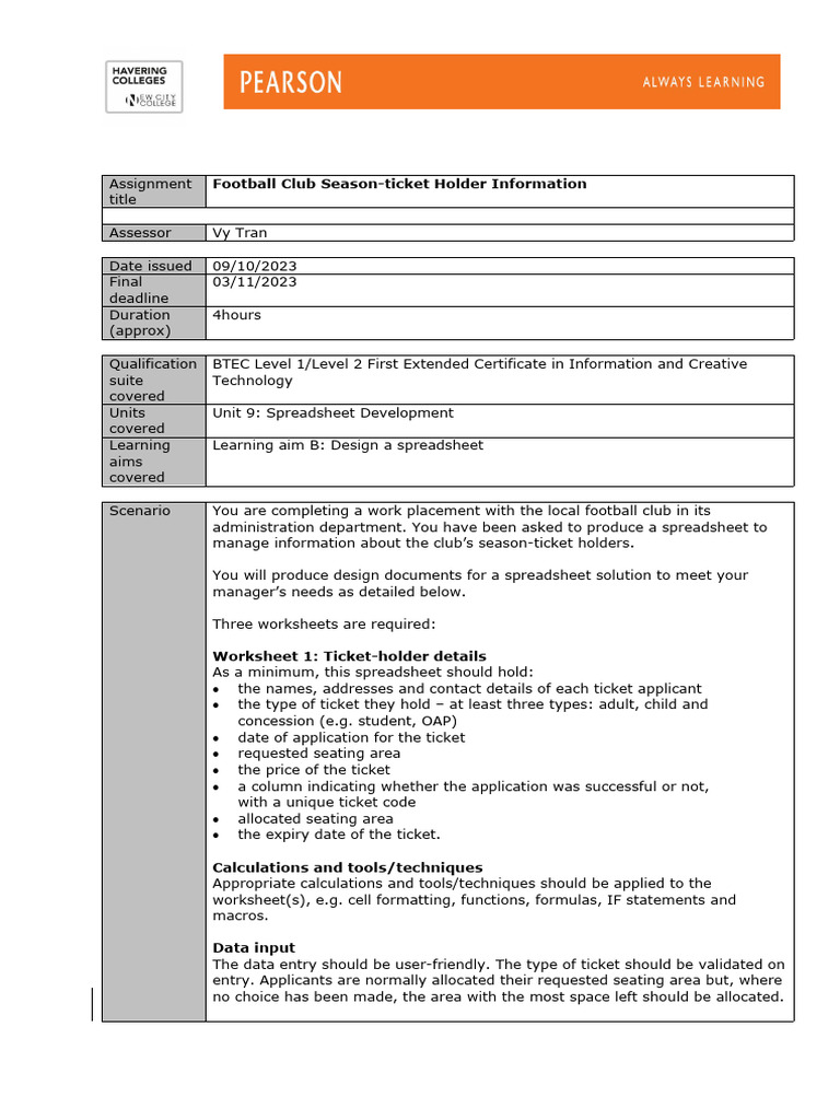 Scenario You are completing a work placement with the local football club in its