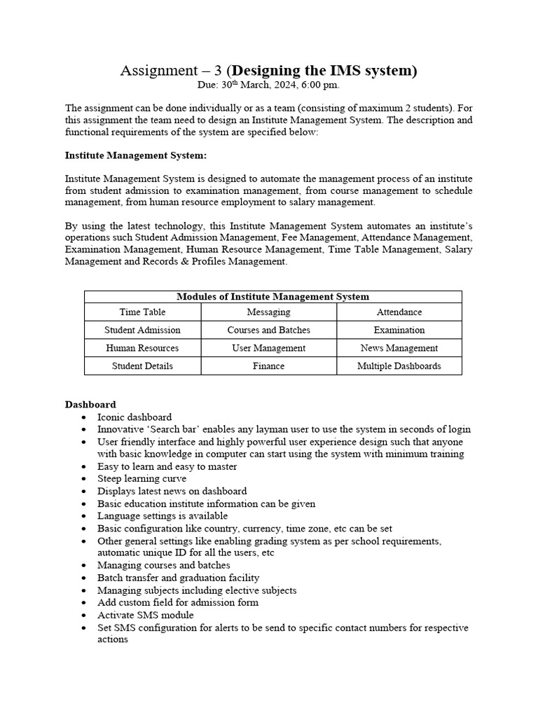 this assignment the team need to design an Institute Management System. The description and
