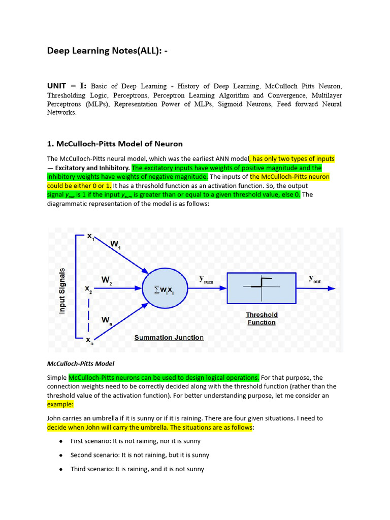 UNIT – I: Basic of Deep Learning - History of Deep Learning, McCulloch Pitts Neuron,