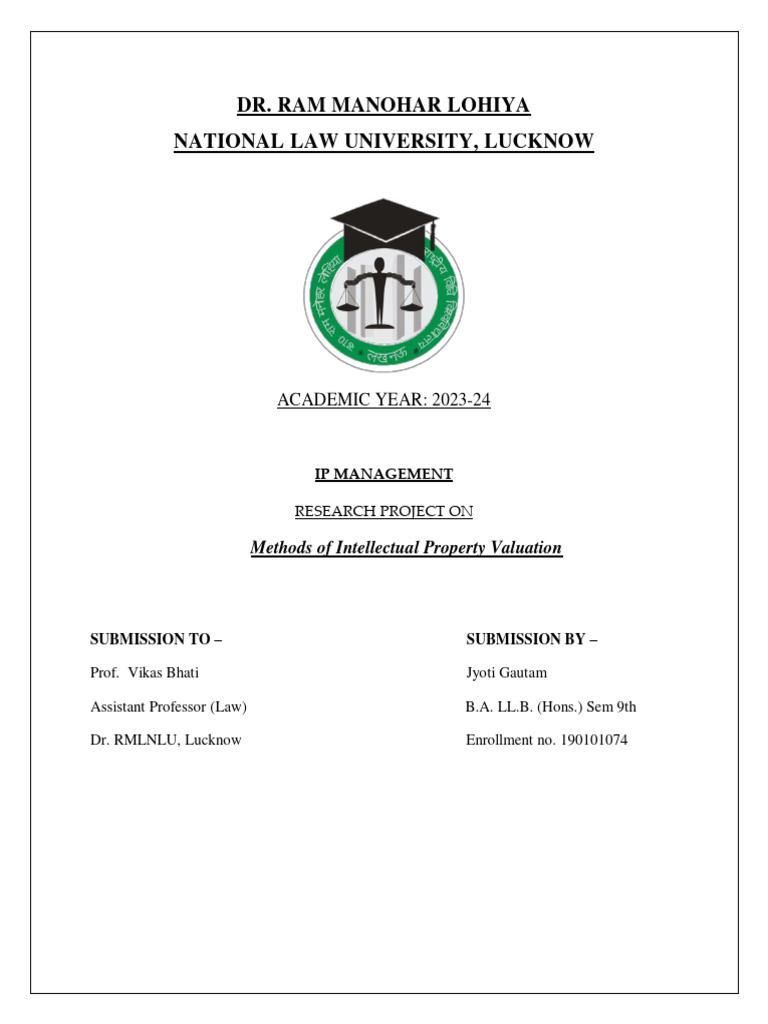 golden opportunity to do this wonderful project on the topic Methods of IP Valuation, which