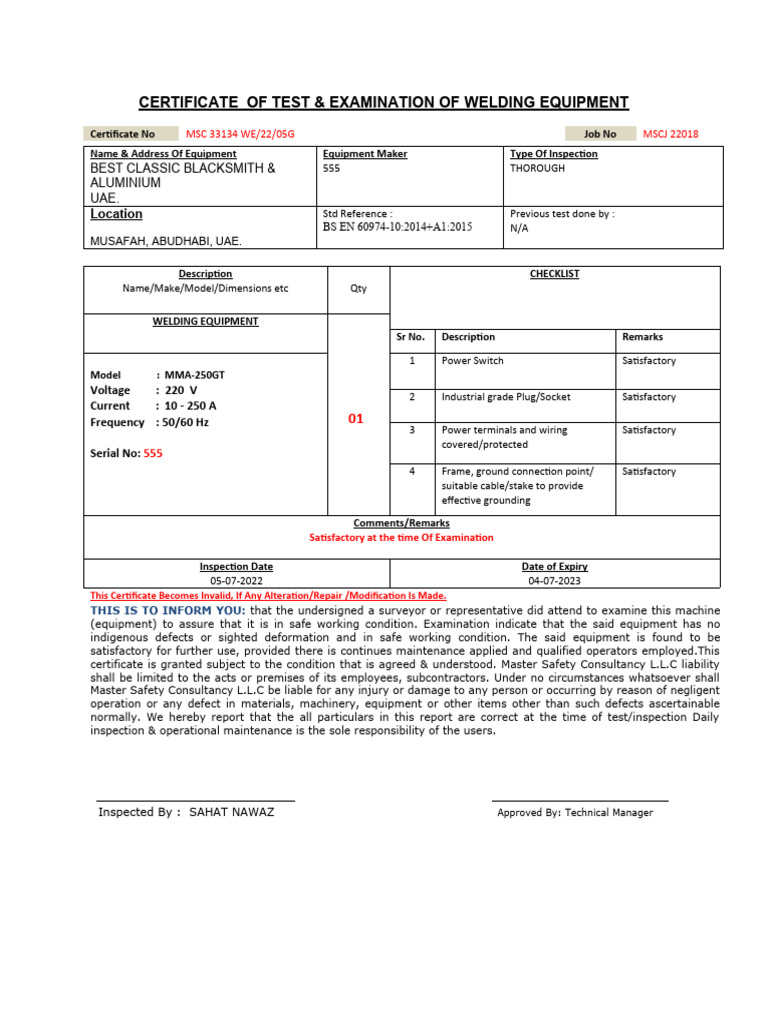 CERTIFICATE OF TEST & EXAMINATION OF WELDING EQUIPMENT