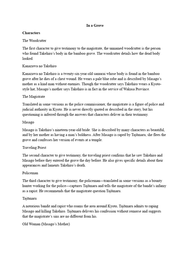 Set in pre-modern Japan, Ryūnosuke Akutagawa’s short story “In a Grove” is a collection of