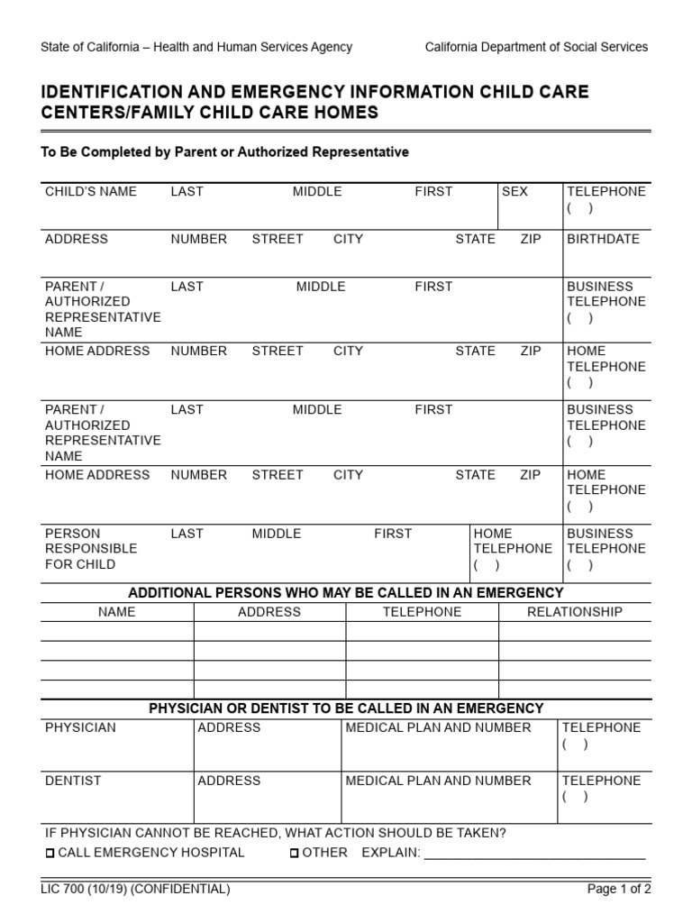 IDENTIFICATION AND EMERGENCY INFORMATION CHILD CARE