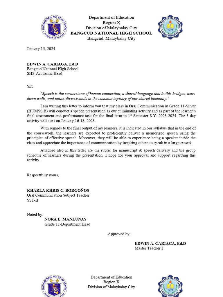 I am writing this letter to inform you that my class in Oral Communication in Grade 11-Silver