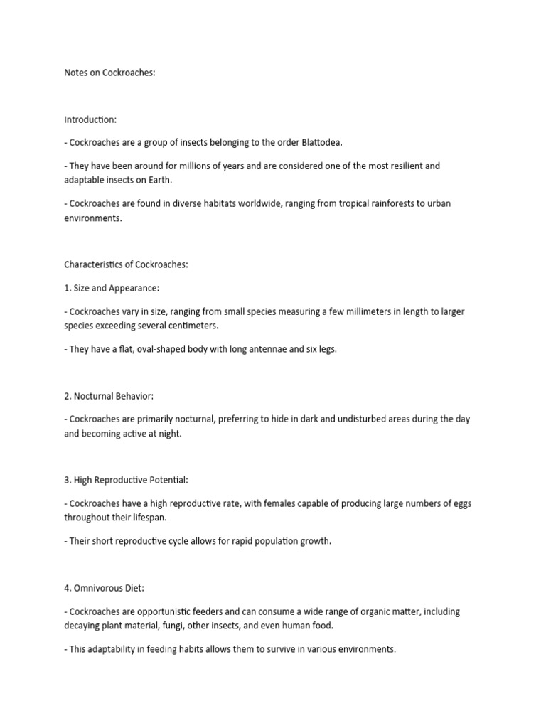 Note: These notes provide a general overview of cockroaches and their characteristics. For more specific