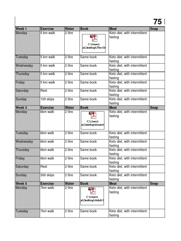 Friday 5 km walk 2 litre Same book Keto diet, with intermittent