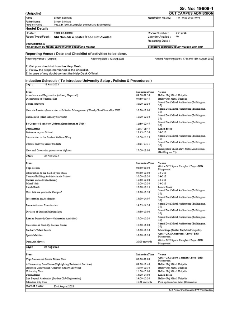 Reporting Venue : (Unipolis) Reporting Date : 12 Aug 2023 Allotted Reporting Date : 17th and 18th August 2023