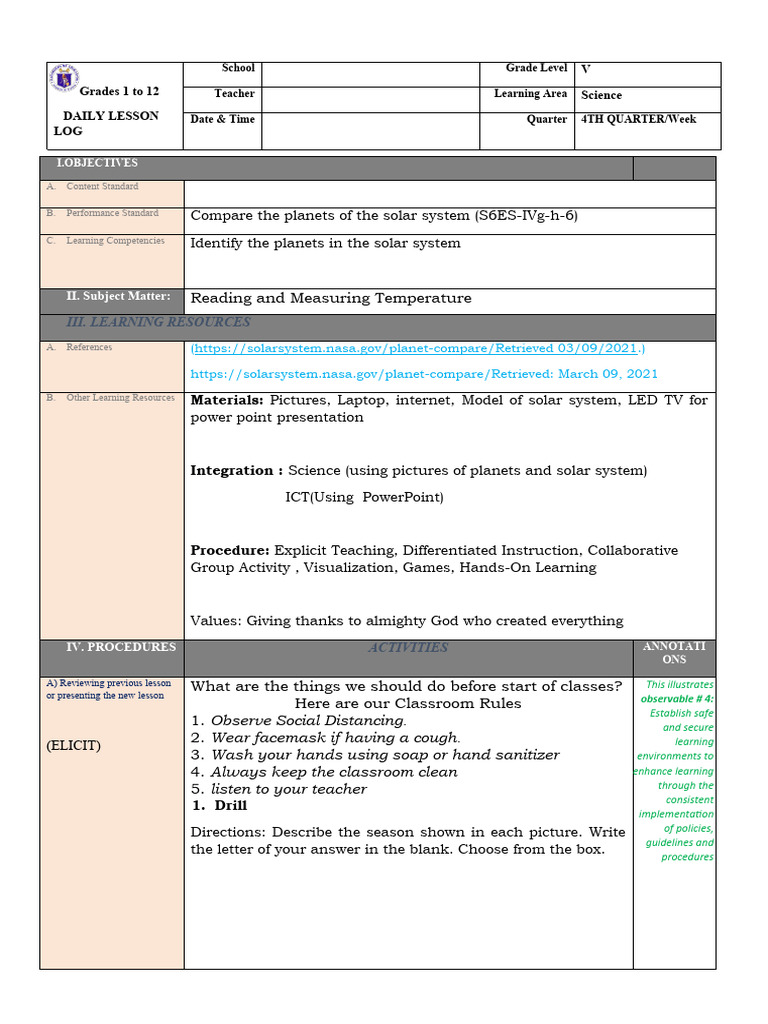 DAILY LESSON Date & Time Quarter 4TH QUARTER/Week