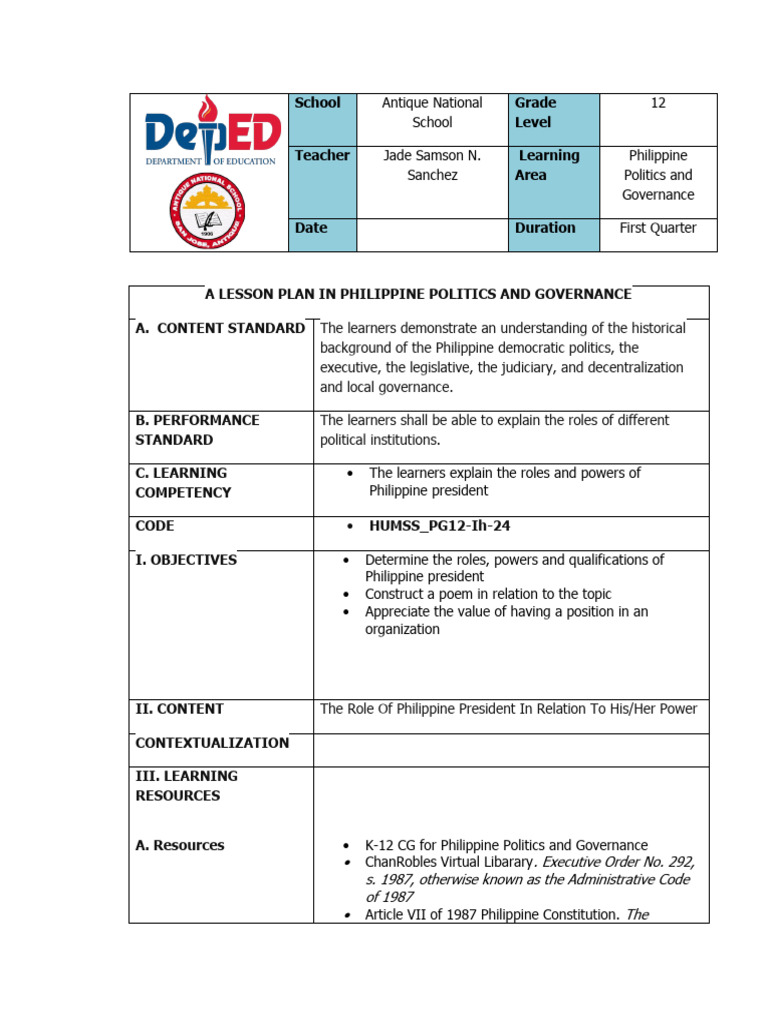 A LESSON PLAN IN PHILIPPINE POLITICS AND GOVERNANCE
