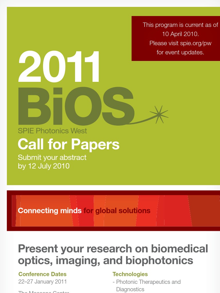 Conferences and Courses: 2227 January 2011 Photonics West Exhibition: 2527 January 2011 BiOS Exhibition: 2223 January 2011