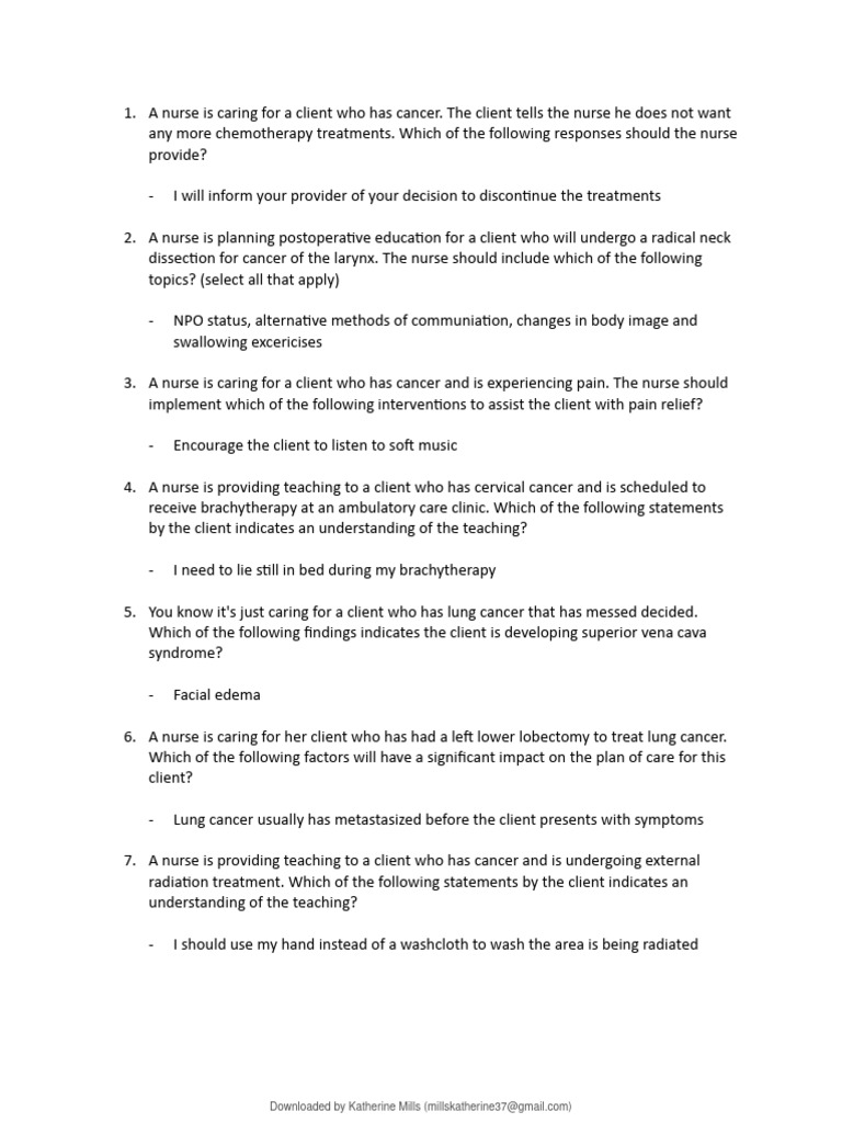 1. A nurse is caring for a client who has cancer. The client tells the nurse he does not want