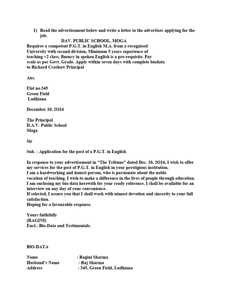 1) Read the advertisement below and write a letter to the advertiser applying for the