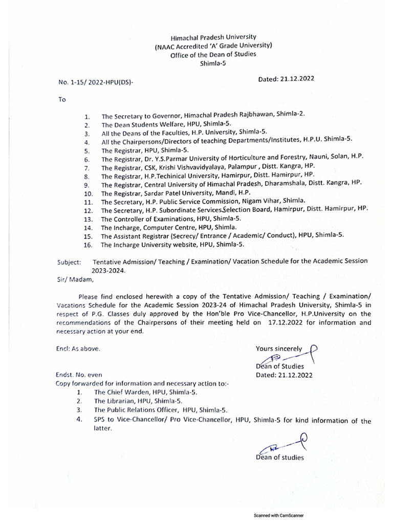 Vacations Schedule for the Academic Session 2023-24 of Himachal Pradesh University, Shimla-5 in