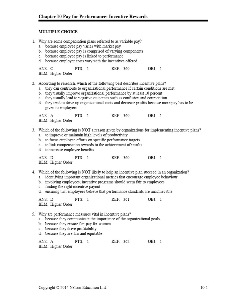 Chapter 10 Pay For Performance: Incentive Rewards: Multiple Choice