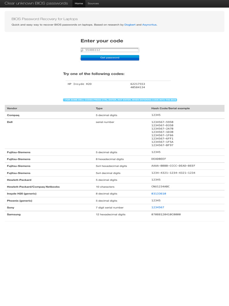 Quick and easy way to recover BIOS passwords on laptops. Based on research by Dogbert and Asyncritus.