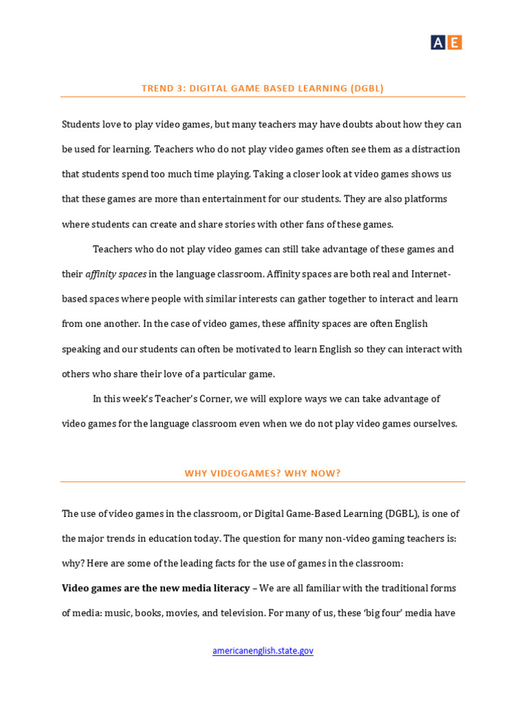 be used for learning. Teachers who do not play video games often see them as a distraction