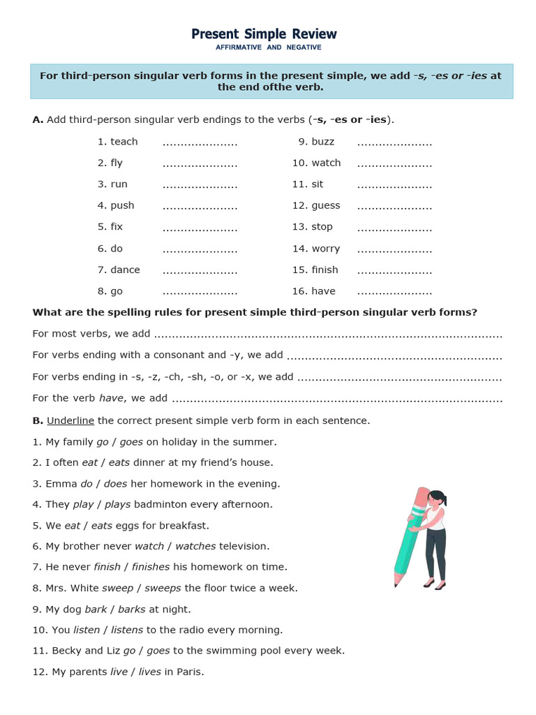A. Add third-person singular verb endings to the verbs (-s, -es or -ies).