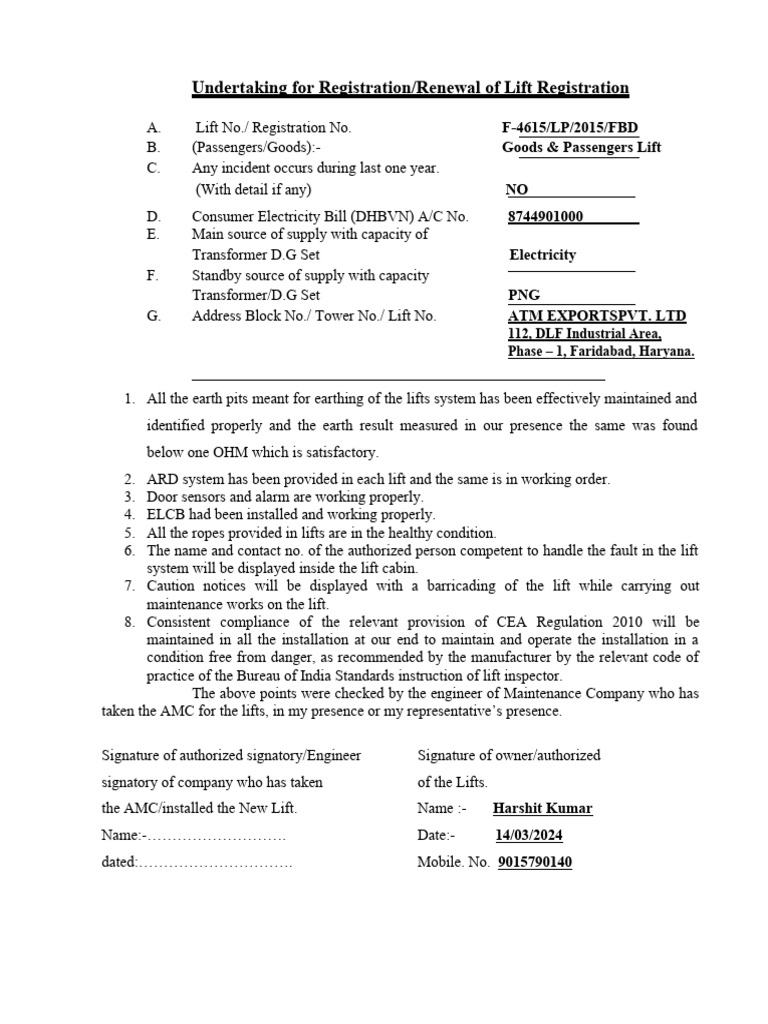 the AMC/installed the New Lift. Name :- Harshit Kumar