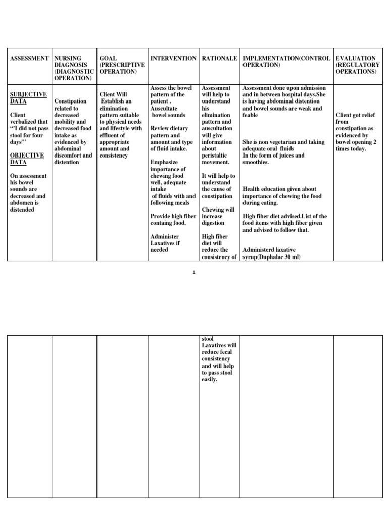 DATA Constipation Establish an patient . understand is having abdominal distention