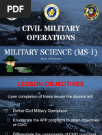 DEFINITION Civil Military Operations (CMO) - encompasses those economic, psycho-political and psychosocial activities undertaken by the AFO of more in coordination with civil government agencies (CGA), local government units (LGU) and non-government organizations (NGO) prior to, during or subsequent to combat operations and/or natural or man-made disasters and calamities. It ranges from the simple, exemplary conduct of the individual soldier to the use of the substantial number of AFP personnel and equipment for large scale community improvement projects that could help remove the root causes of insurgency and encourage/catalyze socio-economic development. Improved military, civil authority and community partnership is also the all important outcome of civil-military operations. CMO objectives are pursued through six (6) interrelated AFP programs generally categorized into: A. AFP Personnel-Oriented Programs: 1. Military Values Education (MILVED) 2. Livelihood Enhancement (LIVELIHOOD) B. Community-Oriented Programs: 3. Community Relations (COMREL) 4. Civic Action (CIVAC) 5. Public Information (PUBLIC INFO) C. Enemy - Oriented Programs: 6. Psychological Operations (PSYOPS) To ensure effectiveness of CMO research and special studies are likewise undertaken as essential supporting activities that make possible the development of relevant messages and appropriate techniques both for message dissemination and feedback analysis, and effective selection of targets/audiences as well as key communicators. II. OBJECTIVES A. Broad Objectives 1. To enrich the soldiers moral, spiritual and nationalistic values and strengthen his commandant to his constitutional role as a defender of his country and protector of his people. Cordially, to enhance his capacity to cope with harsh economic realities through productive livelihood endeavors. 2. To contribute to national growth and development while sustaining a wide base of popular support for the government in general and the AFP in particular through an integrated civilmilitary operations and other psychological actions. 3. To help establish the environmental conductive to the early return to the folds of the law of the various threat groups, organize and motivate them to become productive and law abiding citizens. 4. To develop CMO doctrines, concept, and strategies through continuous research analysis, surveys and special studies. B. Specific Objectives 1. To conduct values education activities among AFP Personnel and their dependents at all levels of command that they may be able to exemplify and inculcate among others moral and ethical standard, and discipline, loyalty and dedication to duty essential in developing and winning public trust and confidence. 2. To train AFP personnel and their dependents in essential vocational skills and provide them the proper motivation and assistance to engage in livelihood projects while in the active service during retirement. 3. To conduct civic action, community relations and public information activities in order to influence the opinions, emotions, attitudes, and behaviors of the general public and/or