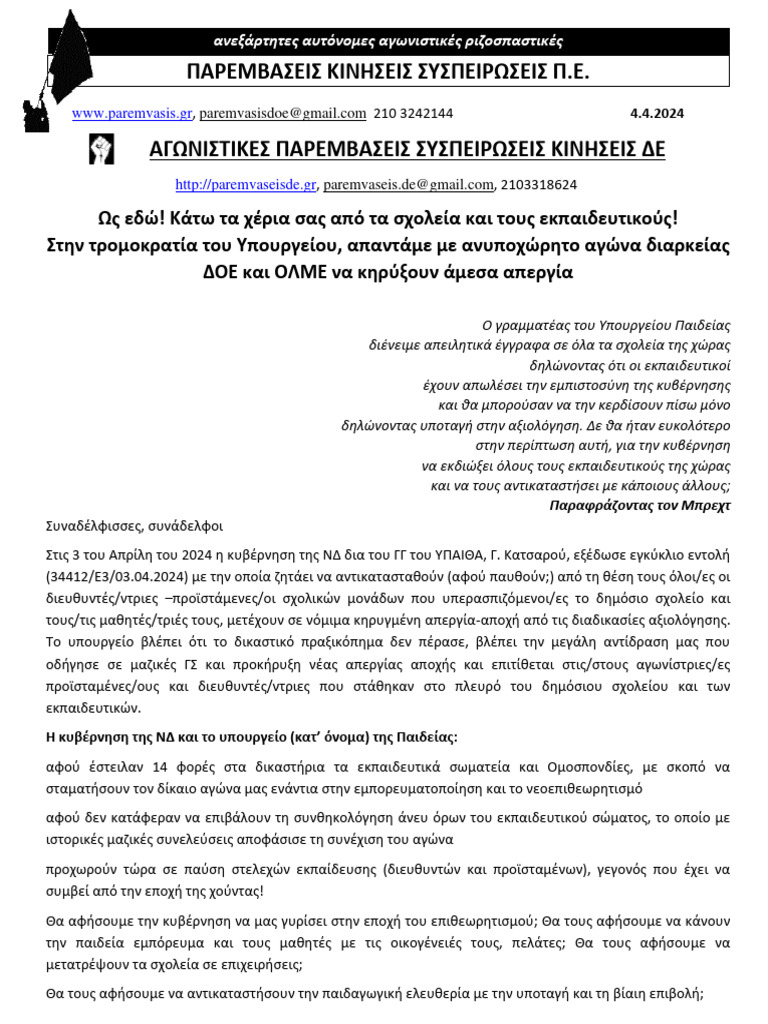(34412/Ε3/03.04.2024) με την οποία ζητάει να αντικατασταθούν (αφού παυθούν;) από τη θέση τους όλοι/ες οι