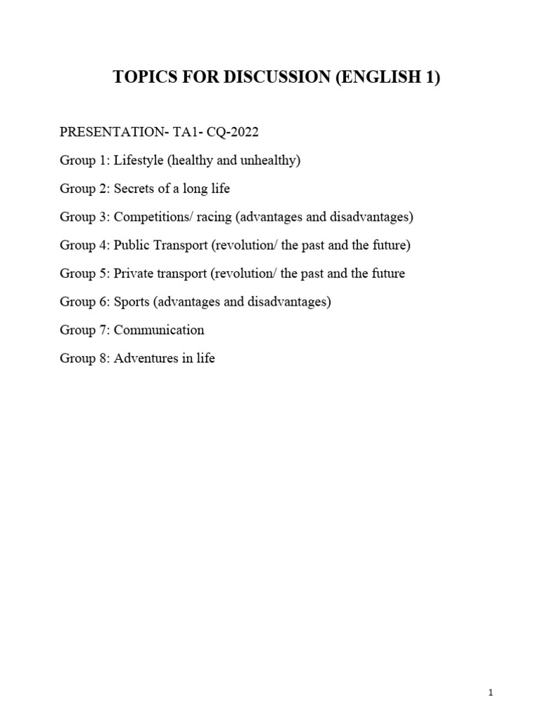 Thảo luận nhóm học phần tiếng Anh 1 có 8 chủ đề (Danh sách chủ đề trang 1).