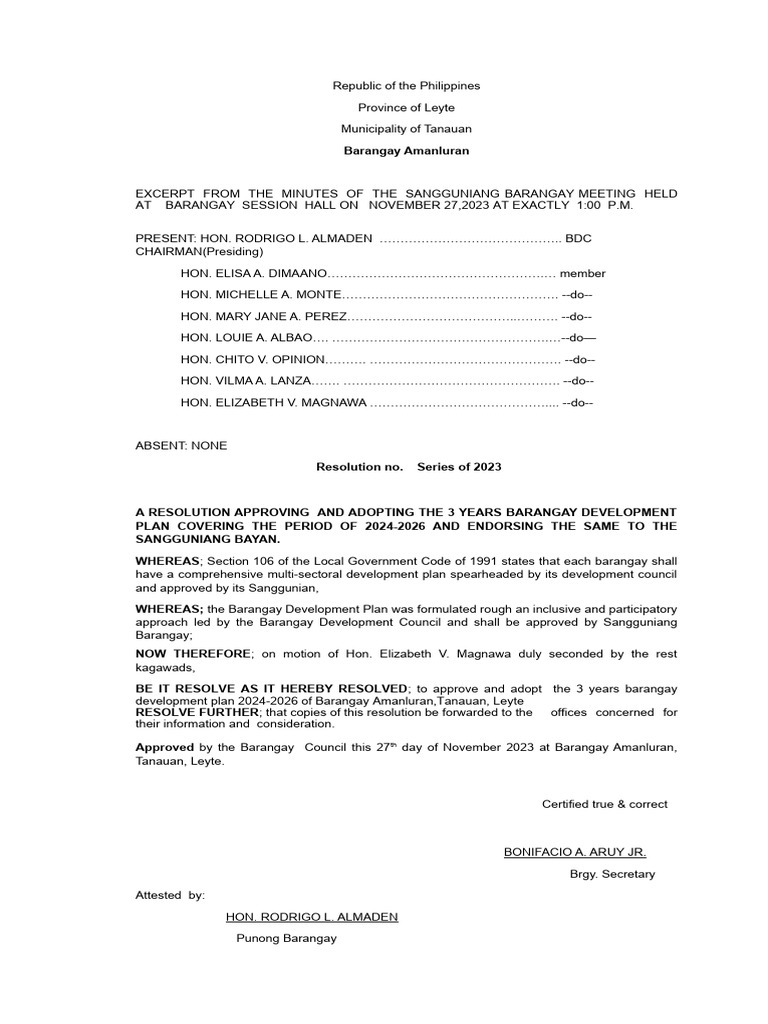 Approved by the Barangay Council this 27th day of November 2023 at Barangay Amanluran,