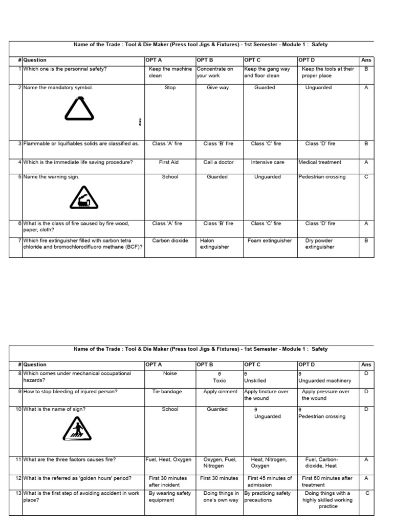 Name of the Trade : Tool & Die Maker (Press tool Jigs & Fixtures) - 1st Semester - Module 1 : Safety