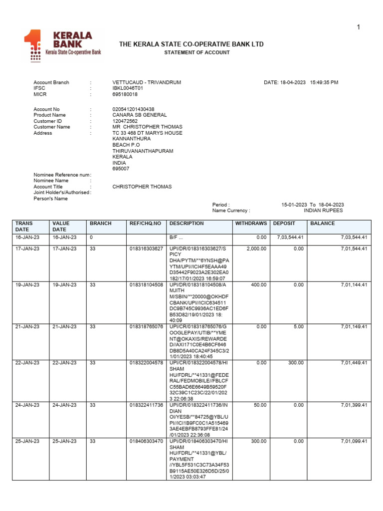 Account Branch : VETTUCAUD - TRIVANDRUM DATE: 18-04-2023 [Link] PM