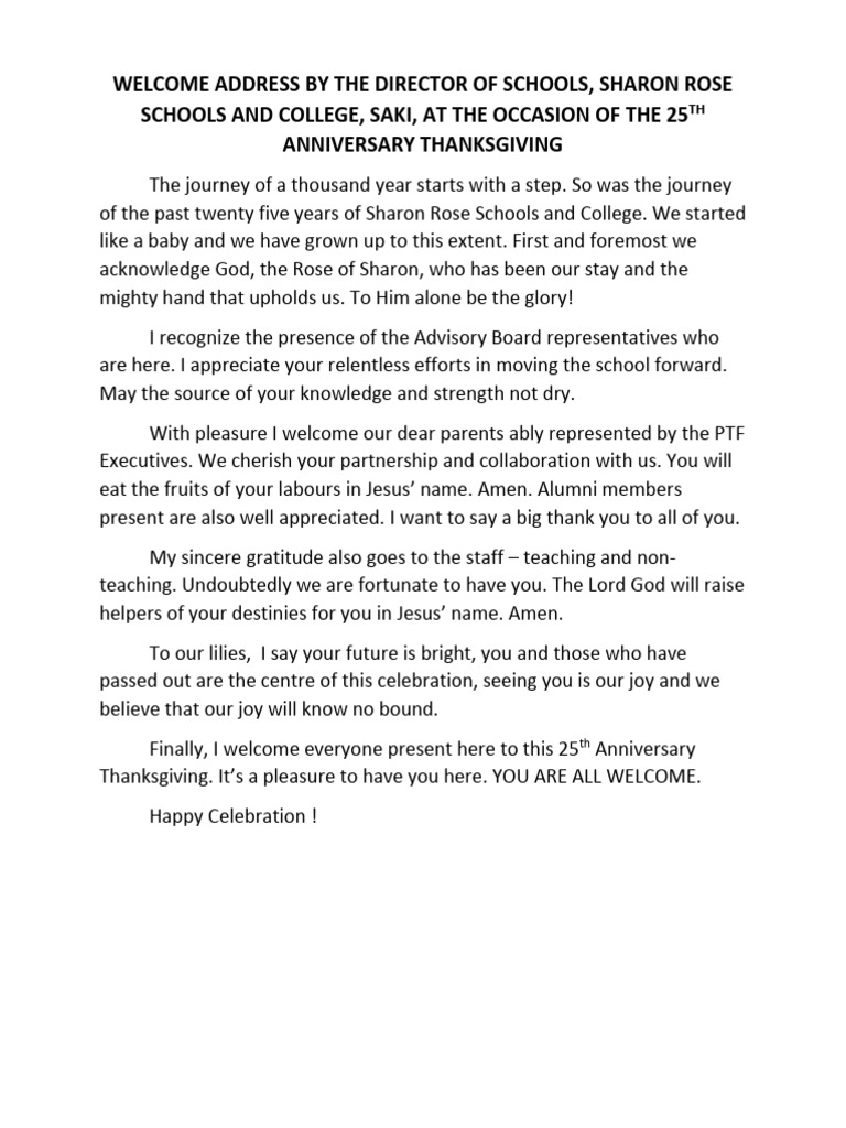 WELCOME ADDRESS BY THE DIRECTOR OF SCHOOLS, SHARON ROSE