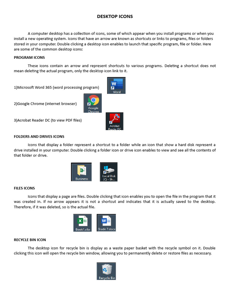 stored in your computer. Double clicking a desktop icon enables to launch that specific program, file or folder. Here