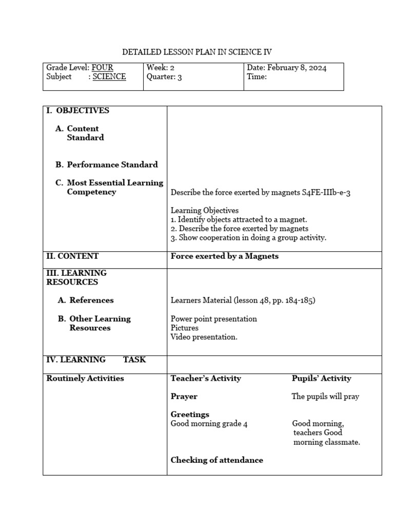 Grade Level: FOUR Week: 2 Date: February 8, 2024