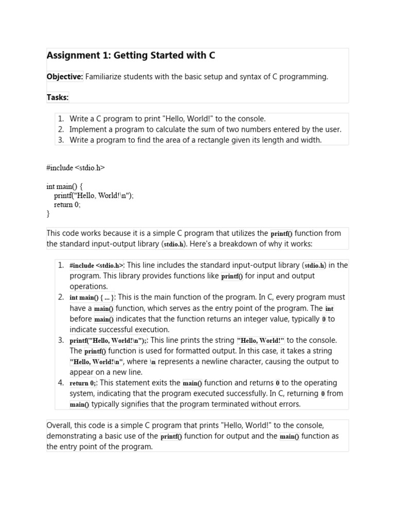Objective: Familiarize students with the basic setup and syntax of C programming.