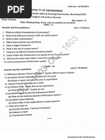 2009 Anna University M.C.A Computer Aplications INFORMATION SECURITY Question paper INFORMATION SECURITY Part-A (20x2=40) 1. What are the Multilayer of the security? 2. Email spoofing? 3. What do you understands by the term methodology ? 4. Explain the Risk Management? 5. Software privacy? 6. What is called Elite Hacker? 7. Clarify Brute force attack? 8. Indicate the necessary of deterrence? 9. What you mean by liability? 10. State dumpster driving? 11. List out three categories of control ? 12. Def transference? 13. what is Policy? 14. Give details about Evidence? 15. What is Firewall? 16. State Alert message? 17. What do you meant by Proxy-server? 18. Define Socks? 19. Specify a padded cell? 20. Define Mantrap? Part-B (12x5=60) 21.a) List out the Components of an Information System? 6 b) Briefly discuss Security System Development life cycle? 6 22. List out the different Attacks caused in the security . Explain any 12? 23. Write short note on Codes of Ethics and professional organizations? 24.a) What is Risk Assessment ? Exp steps? 6