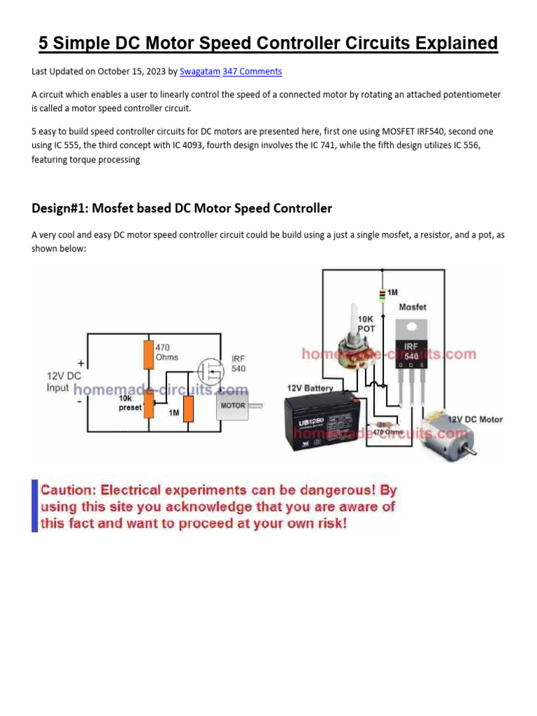 5 easy to build speed controller circuits for DC motors are presented here, first one using MOSFET IRF540, second one