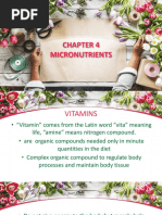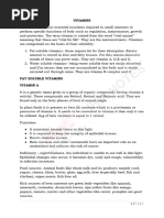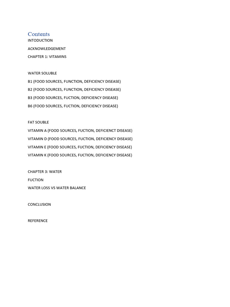 The document provides a comprehensive overview of vitamins, categorizing them into water-soluble and fat-soluble types, detailing their food sources, functions, and associated deficiency diseases. It also includes a chapter on water, discussing its functions and the balance of water loss versus water intake. The document concludes with references for further reading.
