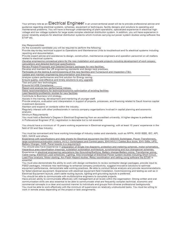Your primary role as an Electrical Engineer in an unconventional asset will be to provide professional advice and