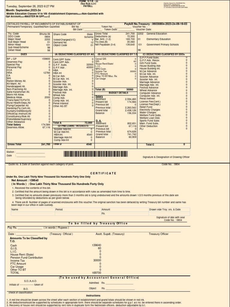 Tuesday, September 26, 2023 6:27 PM PAYBILL O=SCHOOL EDUCATION HARYANA
