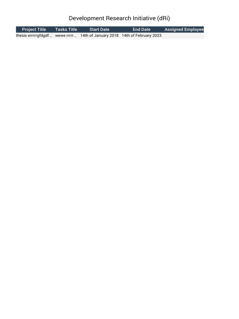 The document outlines a project titled 'Development Research Initiative (dRi)' with a specific task related to a thesis. The project started on January 14, 2018, and ended on February 14, 2023. It also mentions an assigned employee for the project.