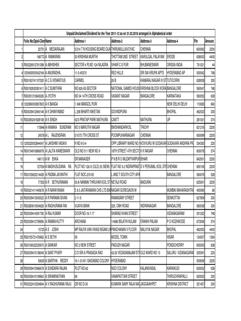 Unpaid/Unclaimed Dividend for the Year 2011-12 as on 31.03.2016 arranged in Alphabetical order