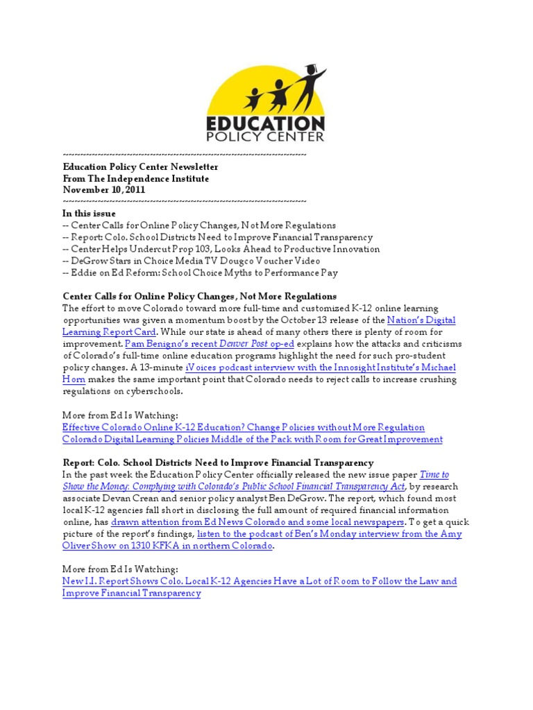 -- Center Calls for Online Policy Changes, Not More Regulations -- Report: Colo. School Districts Need to Improve Financial Transparency -- Center Helps Undercut Prop 103, Looks Ahead to Productive Innovation -- DeGrow Stars in Choice Media TV Dougco Voucher Video -- Eddie on Ed Reform: School Choice Myths to Performance Pay Center Calls for Online Policy Changes, Not More Regulations The effort to move Colorado toward more full-time and customized K-12 online learning opportunities was given a momentum boost by the October 13 release of the Nations Digital Learning Report Card. While our state is ahead of many others there is plenty of room for improvement. Pam Benignos recent Denver Post op-ed explains how the attacks and criticisms of Colorados full-time online education programs highlight the need for such pro-student policy changes. A 13-minute iVoices podcast interview with the Innosight Institutes Michael Horn makes the same important point that Colorado needs to reject calls to increase crushing regulations on cyberschools. More from Ed Is Watching: Effective Colorado Online K-12 Education? Change Policies without More Regulation Colorado Digital Learning Policies Middle of the Pack with Room for Great Improvement Report: Colo. School Districts Need to Improve Financial Transparency In the past week the Education Policy Center officially released the new issue paper Time to Show the Money: Complying with Colorados Public School Financial Transparency Act, by research associate Devan Crean and senior policy analyst Ben DeGrow. The report, which found most local K-12 agencies fall short in disclosing the full amount of required financial information online, has drawn attention from Ed News Colorado and some local newspapers. To get a quick picture of the reports findings, listen to the podcast of Bens Monday interview from the Amy Oliver Show on 1310 KFKA in northern Colorado. More from Ed Is Watching: New I.I. Report Shows Colo. Local K-12 Agencies Have a Lot of Room to Follow the Law and Improve Financial Transparency