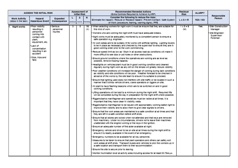 1. Night works • Poor visibility • Serious 3 5 15 • When selecting workers for night work it must be ensure that they are suitable for 1x5=5 Yes • Site/ Construction