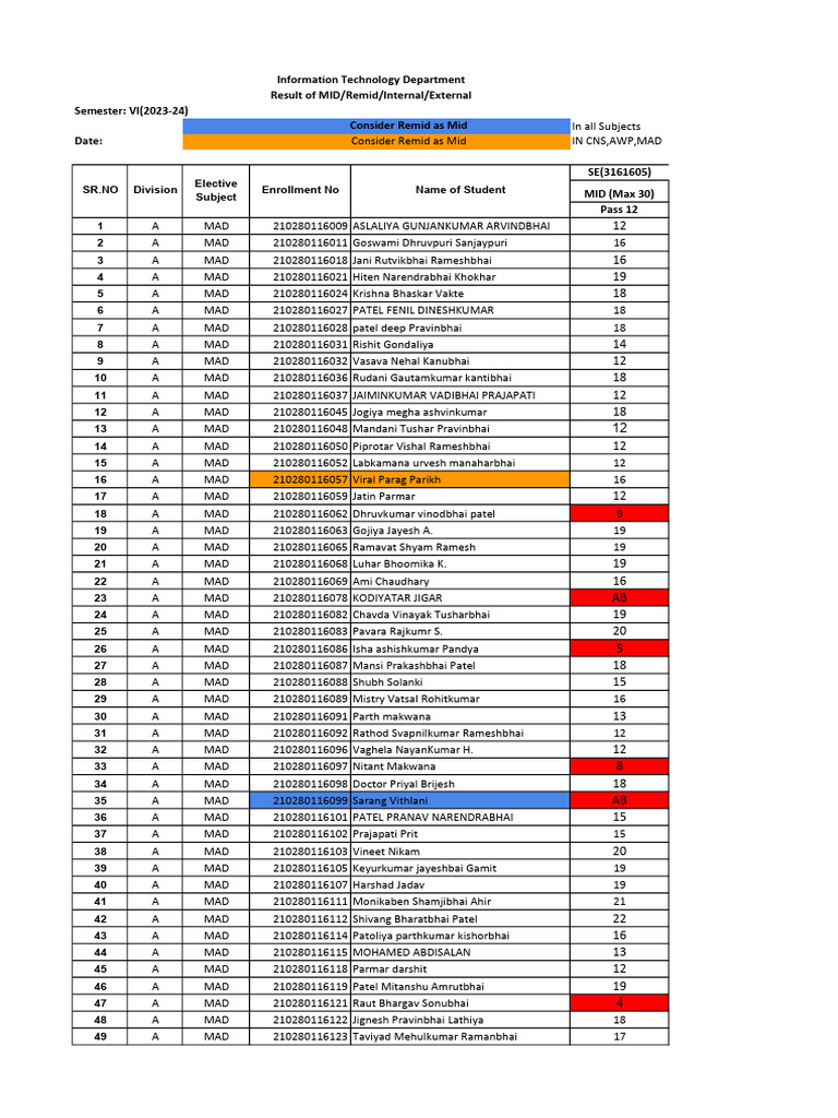 SR.NO Division Enrollment No Name of Student MID (Max 30)