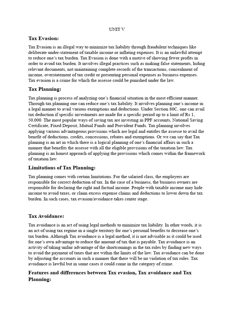 Planning, Tax avoidance and Tax evasion. All the methods are different and