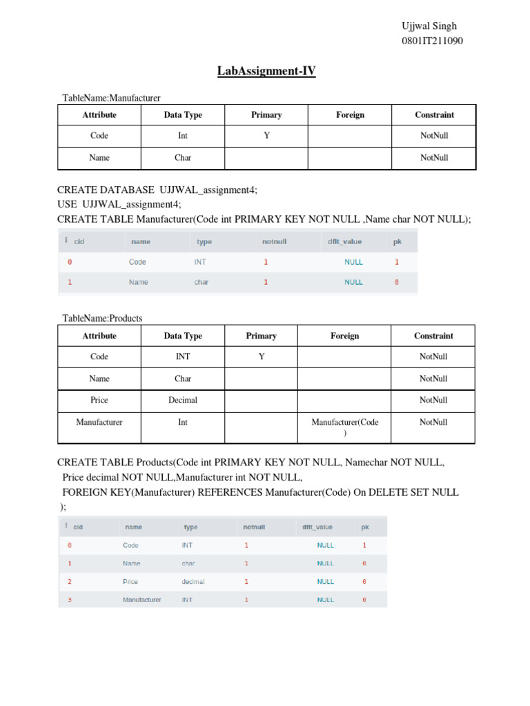 CREATE TABLE Manufacturer(Code int PRIMARY KEY NOT NULL ,Name char NOT NULL);