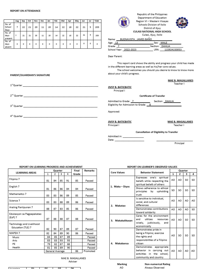 Admitted to Grade: _7________ __ Section: _DAHLIA_____