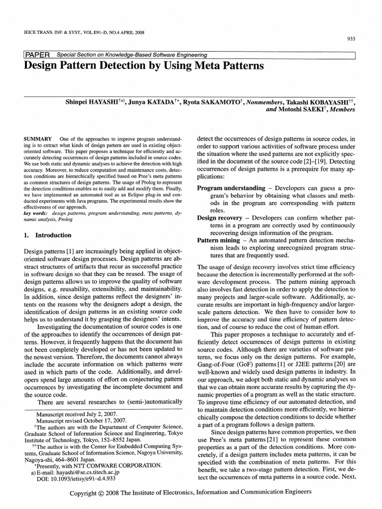 DOI:10.1093/ietisy/e91-d.4.933 tect the occurrences of meta patterns in a source code. Next,